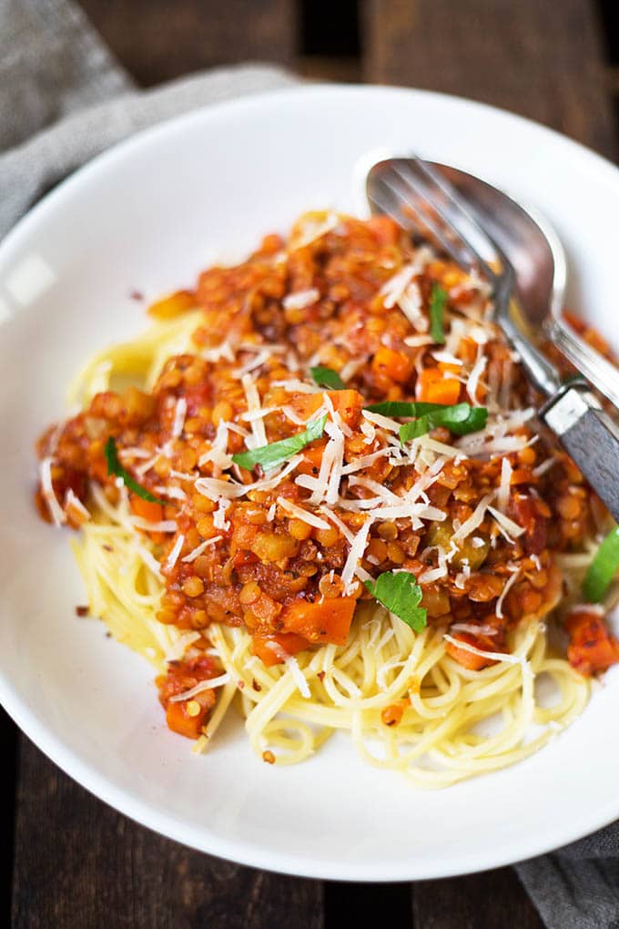 Diese vegane rote Linsen Bolognese ist hier ein echter Evergreen beim gesunden Mittagessen mit der Familie. Ich koche sie mittlerweile mit meinem Sohn zusammen und mache direkt eine extra große Portion. Die Reste lassen sich super einfrieren und so sind ganz schnell die liebsten Nudeln zubereitet, wenn ich keine Lust zum Kochen habe.
