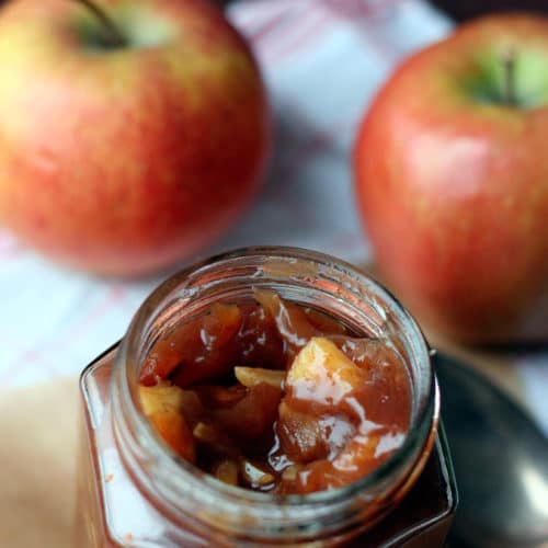 Kleine karamellisierte Apfelstückchen, Zimt und geröstete Mandeln machen die 4-Zutaten Bratapfelmarmelade zur winterlichen Lieblingsmarmelade.
