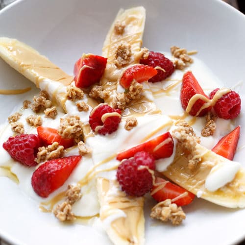 Leute, ich kann nicht mehr. Dieses 5-Minuten gesundes Bananensplit! Dekadent dick mit Erdnussbutter bestrichen. Obendrauf gibt’s Naturjoghurt, Beeren, ein wenig Knuspermüsli und auch noch flüssigen Honig on top. Gute Zeiten warten auf euch! ?