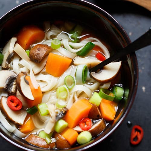 Ich kann mir zum Beispiel auch super Paprika, Pak Choi, Zuckerschoten, Erbsen oder Zucchini in der Suppe vorstellen. Außerdem könnt ihr bei den Nudeln variieren. Ich habe asiatische Weizennudeln genommen, Ramen-Nudeln und Mie-Nudeln passen aber auch ganz wunderbar.