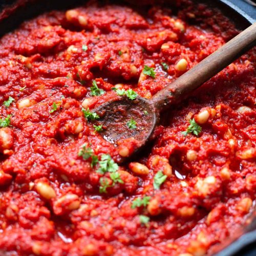 Richtig lecker ist dieses Rezept übrigens auch mit einer Mischung aus unterschiedlichen Bohnen (z.B. Kidneybohnen und schwarze Bohnen). Was für mich dabei auf keinen Fall fehlen darf: Avocado. Die herrlich cremige Avo harmoniert nämlich perfekt mit den deftigen, in Tomatensauce gekochten Bohnen.