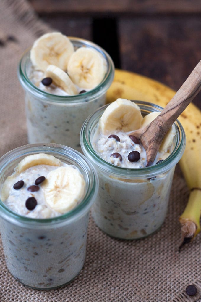 Außerdem, dieser Geschmack! Die Bananen-Schoko Overnight Oats sind eine grandiose Mischung aus cremig-süßer Banane und dicken Schoko-Drops. Dazu gibt es für die Sättigung Haferflocken, griechischen Joghurt und Chiasamen. So schnell, einfach und lecker kann Frühstück sein Freunde.