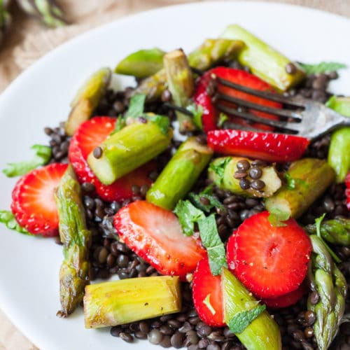 Leichter Belugalinsen-Salat mit Erdbeeren und grünem Spargel