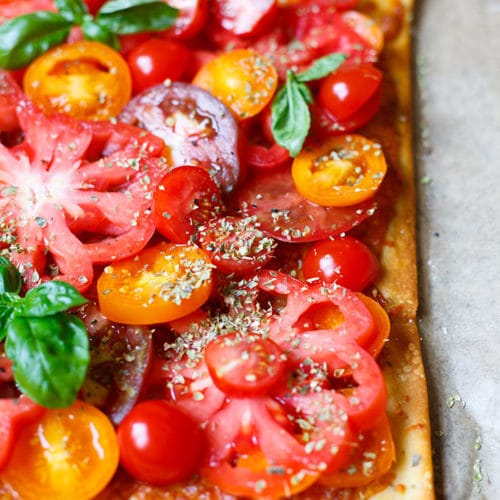 Inspiration für das Rezept war diese wunderschöne Heirloom Tomato Cheddar Tart, die ich nur noch ein wenig vereinfacht habe. Statt grünem Pesto und geriebenen Cheddar kommt bei uns geriebener Mozzarella auf die Tarte und die fancy Gewürzmischung habe ich gegen good old Oregano ausgetauscht. Fertisch.