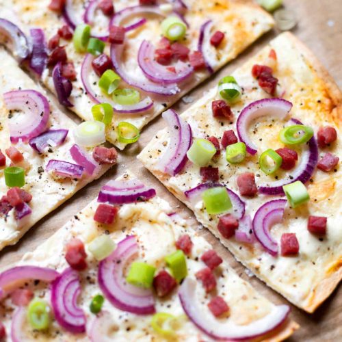 Ich verrat es euch: Knuspriger Flammkuchen, bestrichen mit ordentlich Schmand und getoppt mit roten Zwiebeln und Schinkenwürfelchen, bei dem ihr euch NICHT um den Teig kümmern müsst. Ohhh ja, dieses Wunder von einem Abendessen heißt Blitz-Flammkuchen und ist genau das, was euch zum Feierabendglück noch gefehlt hat.