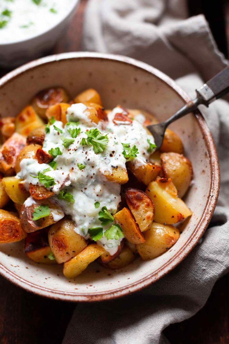 Einfache Knoblauch-Ofenkartoffeln mit Tzatziki (Nur 5 Zutaten!)