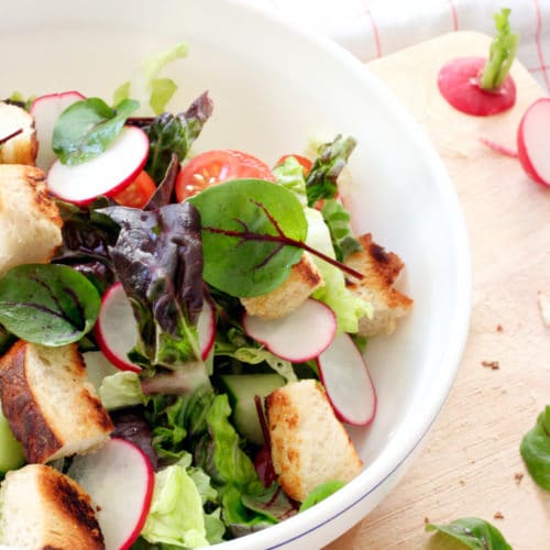 Wir sprechen hier von knackigen Gurkenstücken, Radieschen, Tomaten und einer bunten Baby-Blattsalat Mischung. Was den Salat aber wirklich perfekt macht, sind das easypeasy Honig-Senf-Dressing und die goldbraunen Brezen-Croutons.