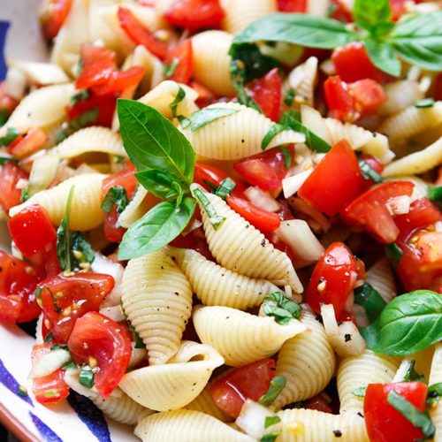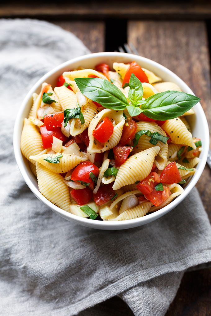 Tomaten und eine Wagenladung duftendes Basilikum sind ja sowieso a match made in heaven. Wenn dann auch noch Pasta, Zwiebelwürfelchen und Knoblauch ins Spiel kommen und sich das Ganze mit einem Dressing aus Olivenöl und Aceto balsamico vollsaugt, ist ganz großes Geschmackskino vorprogrammiert.