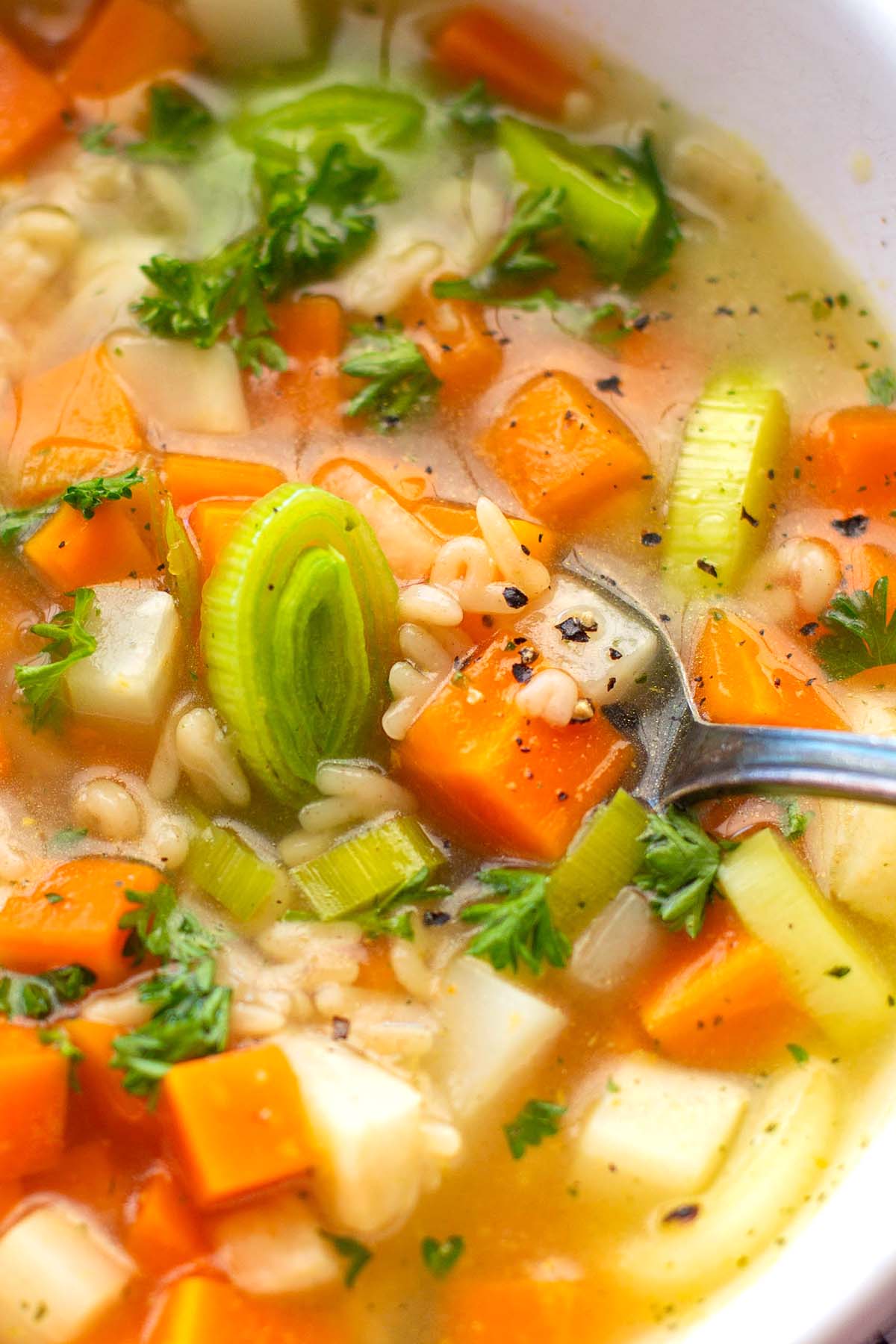 • Vollgepackt mit Gemüse, Nudeln und Brühe.