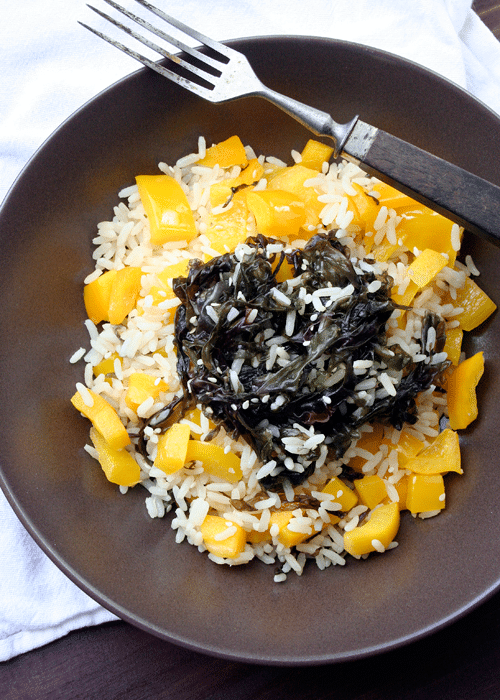 Viele der Rezepte lesen sich genauso großartig wie ungewöhnlich. Natürlich musste da auch ein Rezept ausprobiert werden, ich habe mich für den Algen-Sesam-Naturreis von Seite 234  entschieden. Ganz ehrlich, die Meinungen darüber gingen auseinander. Während der Liebste sich gierig den Teller vollschaufelte und begeistert alles ratzeputze leer gefuttert hat, war der Reis mit in Sesamöl angeschwitzten Paprika und Algen nicht so ganz nach meinem Geschmack. Allerdings habe ich auch nicht die empfohlenen Arame-Algen verwendet, sondern bin mangels Auffindbarkeit kurzerhand auf Seetang umgestiegen.