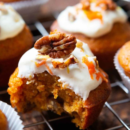 Super Rezepte. Schmecken auch ohne Frosting und sind sehr saftig. Habe braunen Zucker genommen, auf 120g reduziert und Pecan- durch Walnüsse ersetzt.