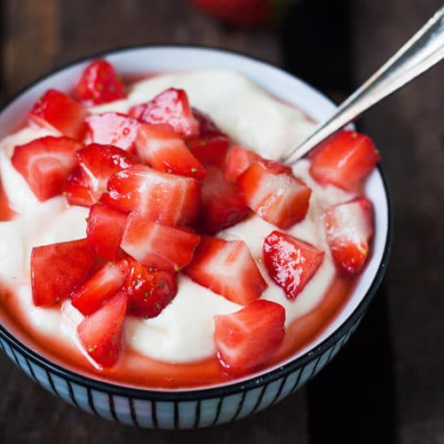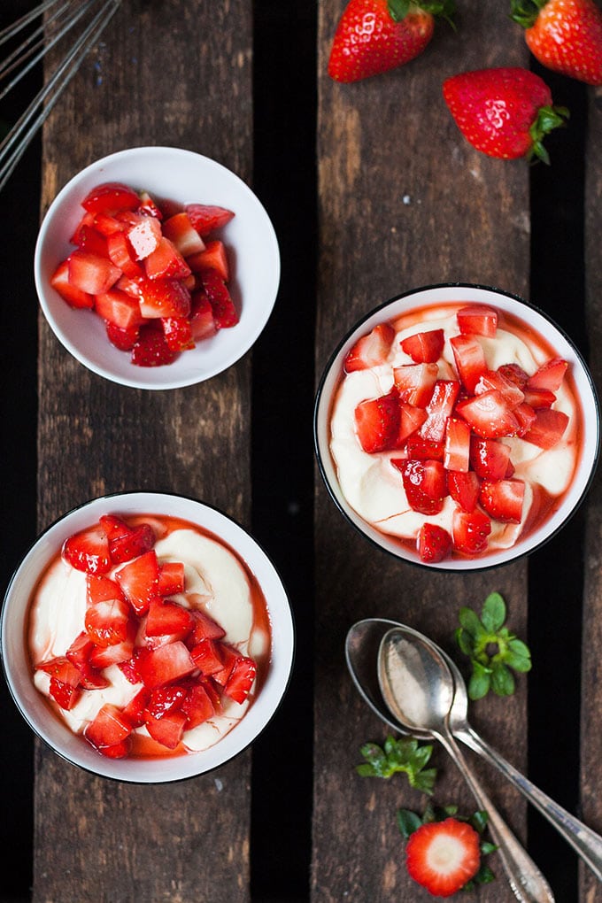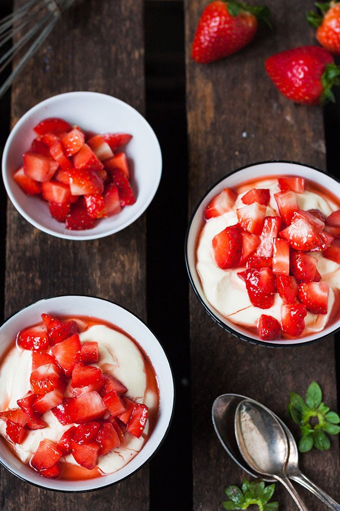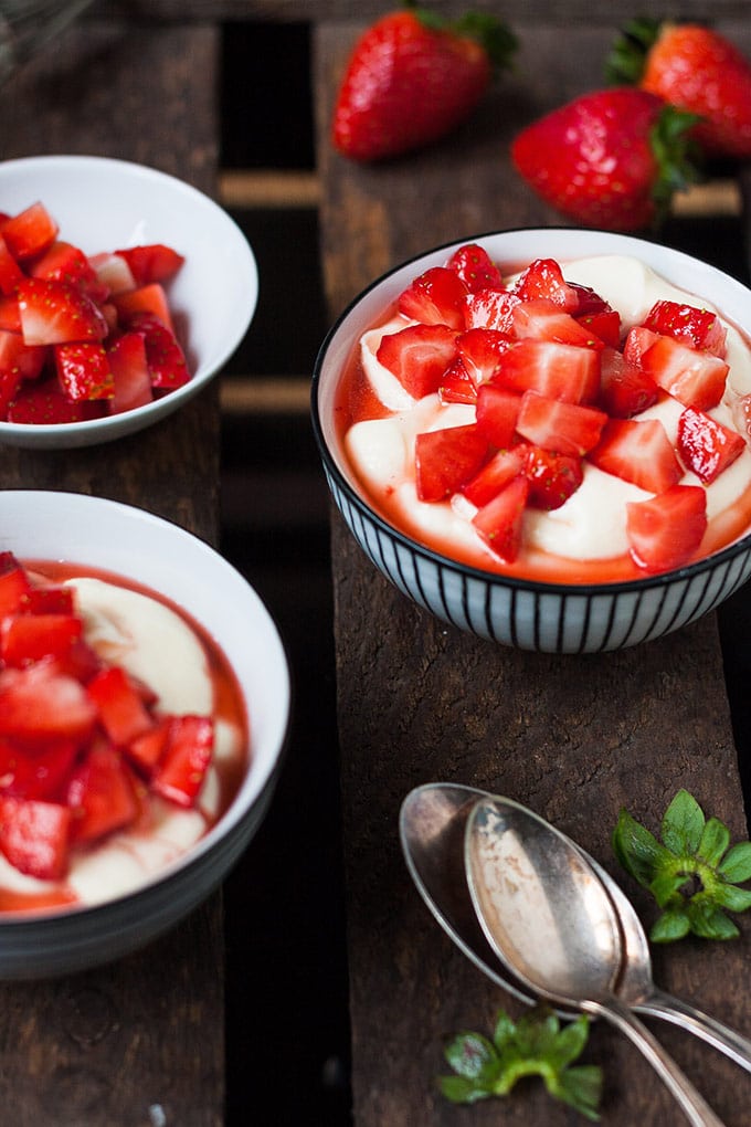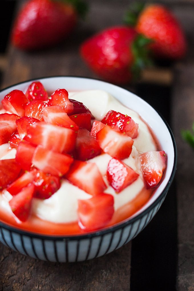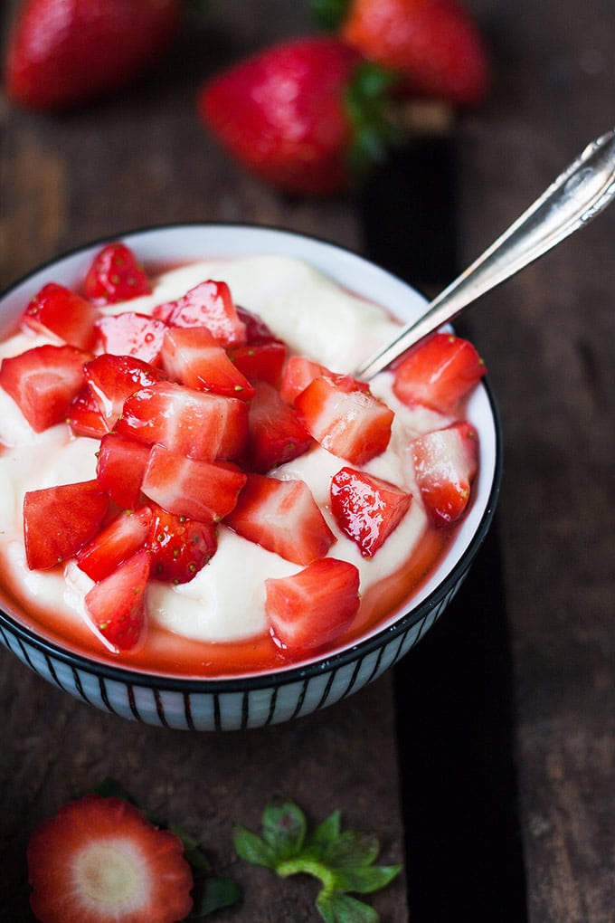 Der Vanillequark mit Erdbeeren aus vier Zutaten ist das flotte Dessert in der Erdbeerzeit.