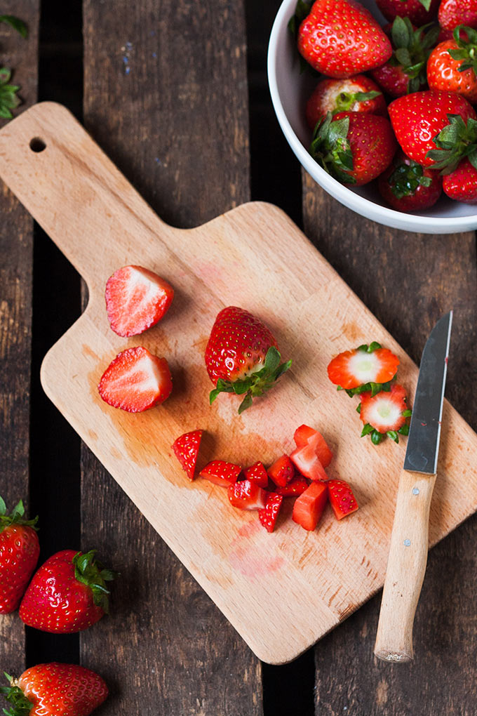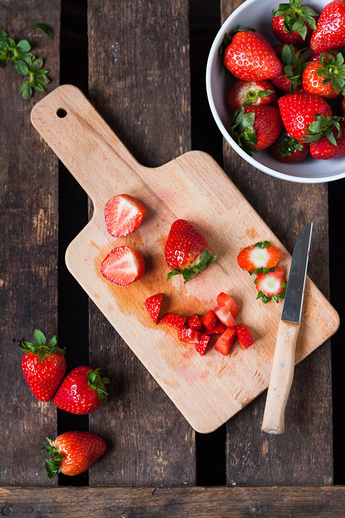 Auch die Erdbeeren könnt ihr ein paar Stunden vor dem Servieren zubereiten. So können sie gut durchziehen und ihr müsst zum Servieren nur noch alles auf Schüsseln verteilen.