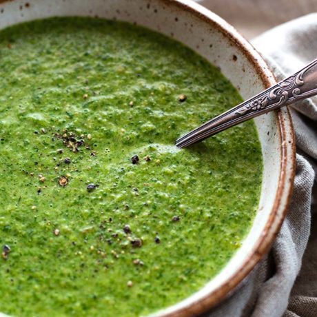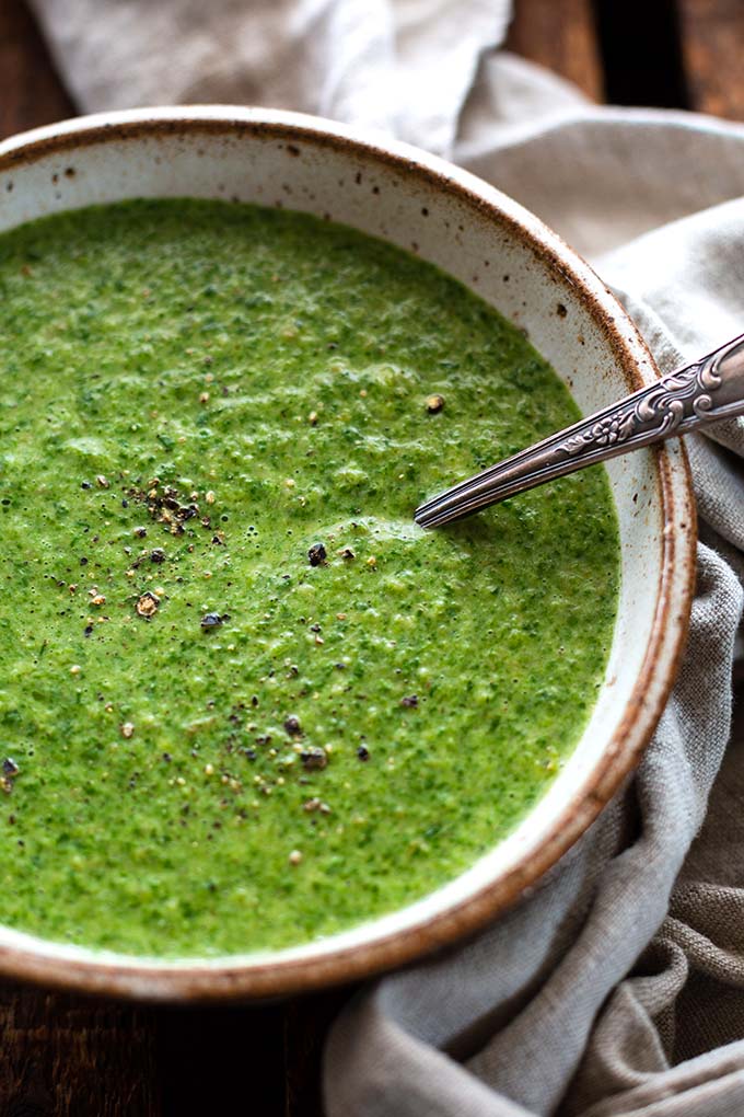 Ok, ich geb’s zu: Auf den ersten Blick sieht die Suppe ein bisschen aus, als würdet ihr nen Paket TK-Spinat löffeln.