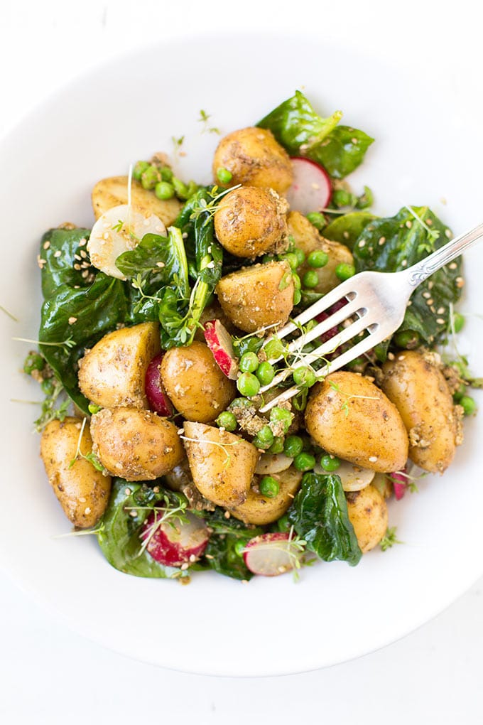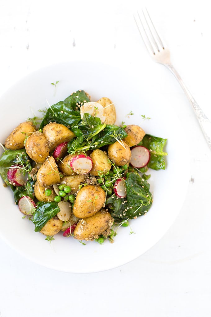 Vielleicht liegt es daran, dass das grüne Pesto sich so perfekt um die Kartoffeln schmiegt und Erbsen, Spinat und Radieschen uns dazu ganz nebenbei mit einer Extraportion Gemüse versorgen. Und zwar direkt im dekadenten Kartoffelsalat, ist das nicht der Knaller?