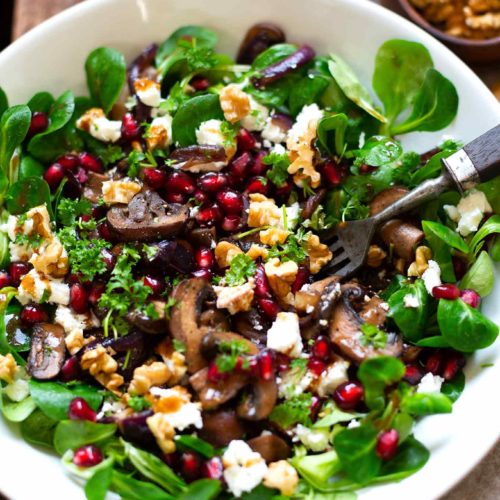 Ach, fast hätt‘ ich’s vergessen: Ihr könnt den Feldsalat mit gebratenen Pilzen, Granatapfel, Feta und Walnüssen natürlich auch ganz nach eurem Geschmack pimpen. Super eignen sich zum Beispiel auch andere Nüsse wie Haselnüsse und Pecannüssen oder Sonnenblumenkerne. Außerdem richtig lecker dazu sind Blaubeeren.