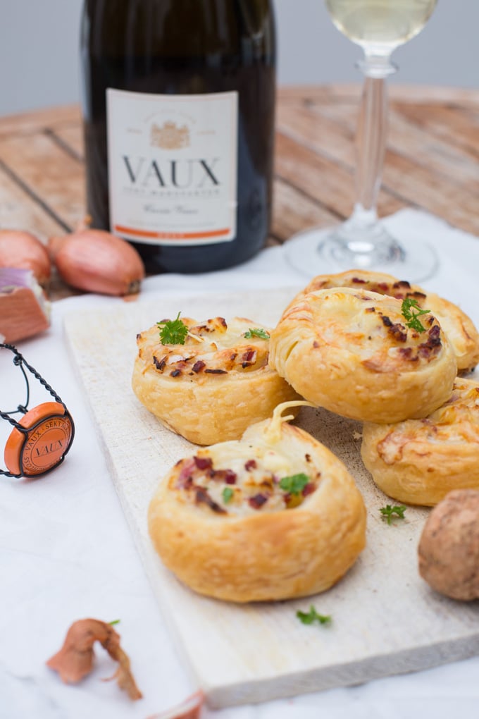 Die knusprigen Schnecken schmecken wie Flammkuchen im Miniformat. Herzhaft, würzig und perfekt mit einem Gläschen Sekt.