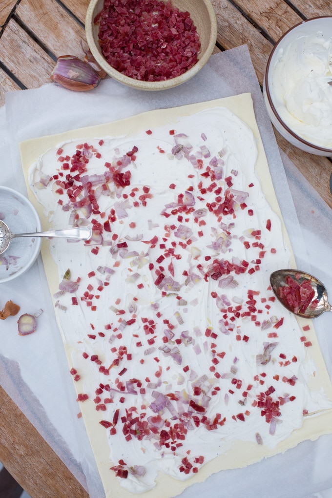 • Blätterteig mit dem Schmand bestreichen. Schinkenwürfel und Schalotten großzügig darauf verteilen.