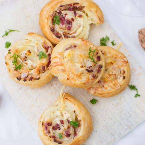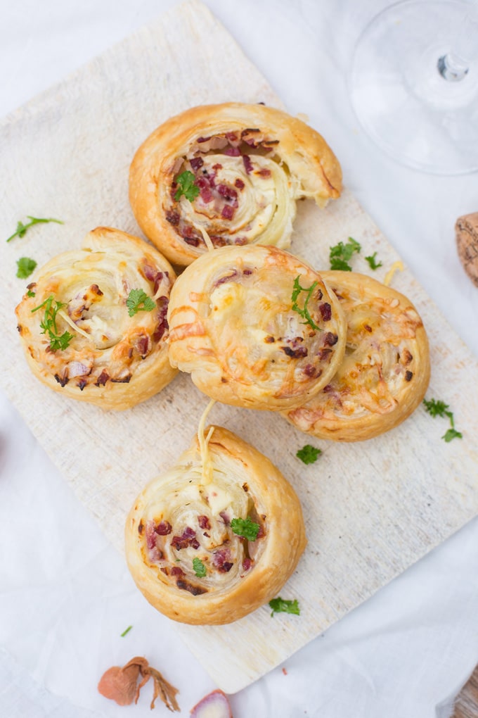 Bei uns gibt es in diesem Jahr meinen absoluten Liebling: Flammkuchen-Schnecken aus Blätterteig.