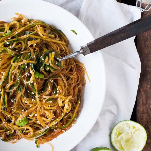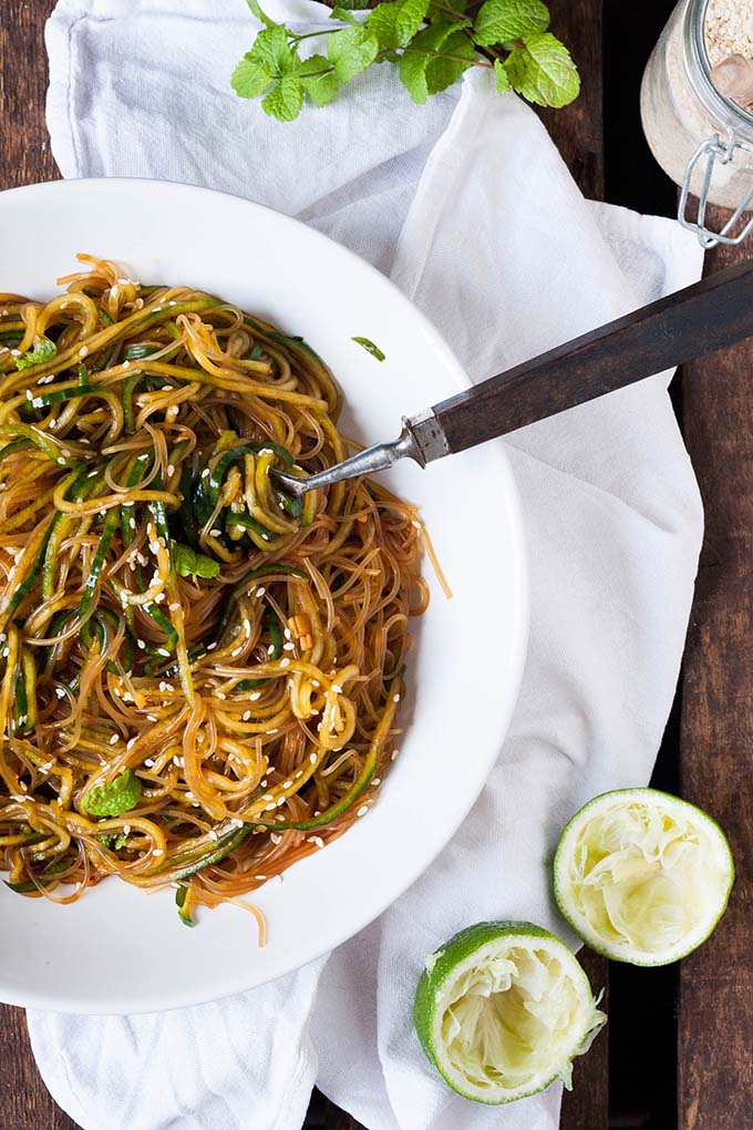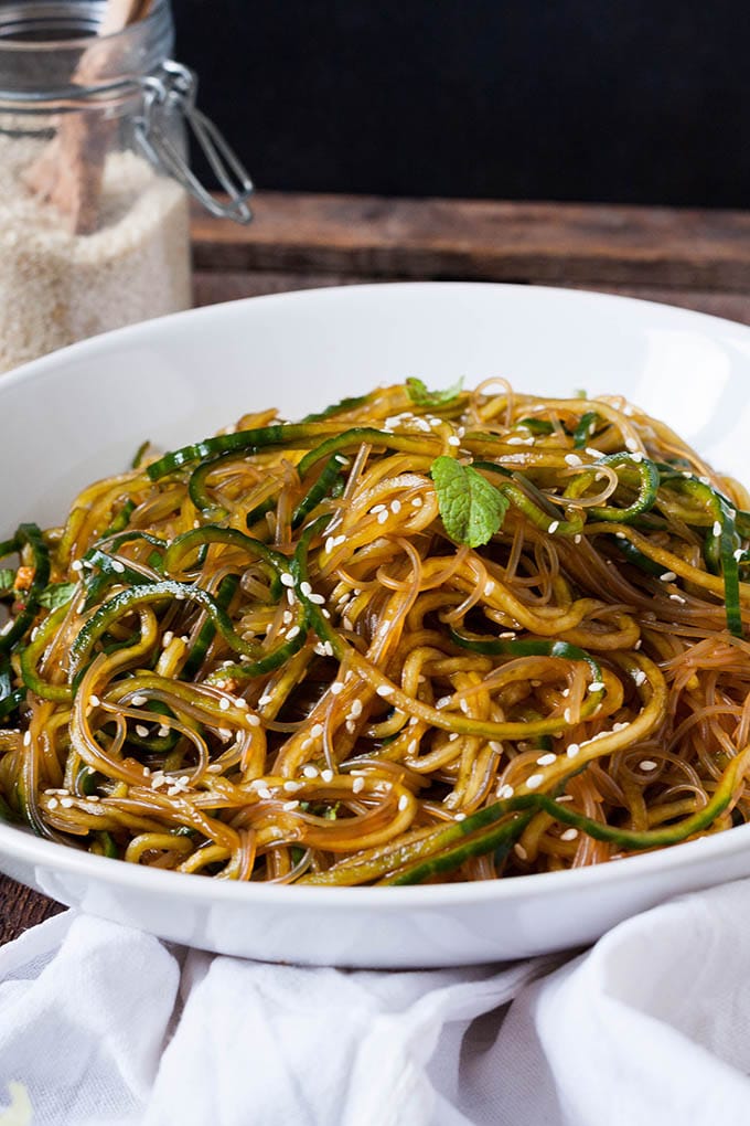Schneller Glasnudelsalat mit Gurken-Spaghetti, Sesam und Minze. Dieses 10-Minuten Rezept ist schnell, leicht und trotzdem sättigend. Sooo gut!