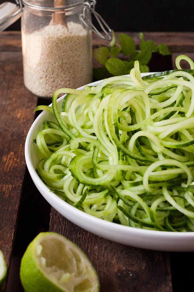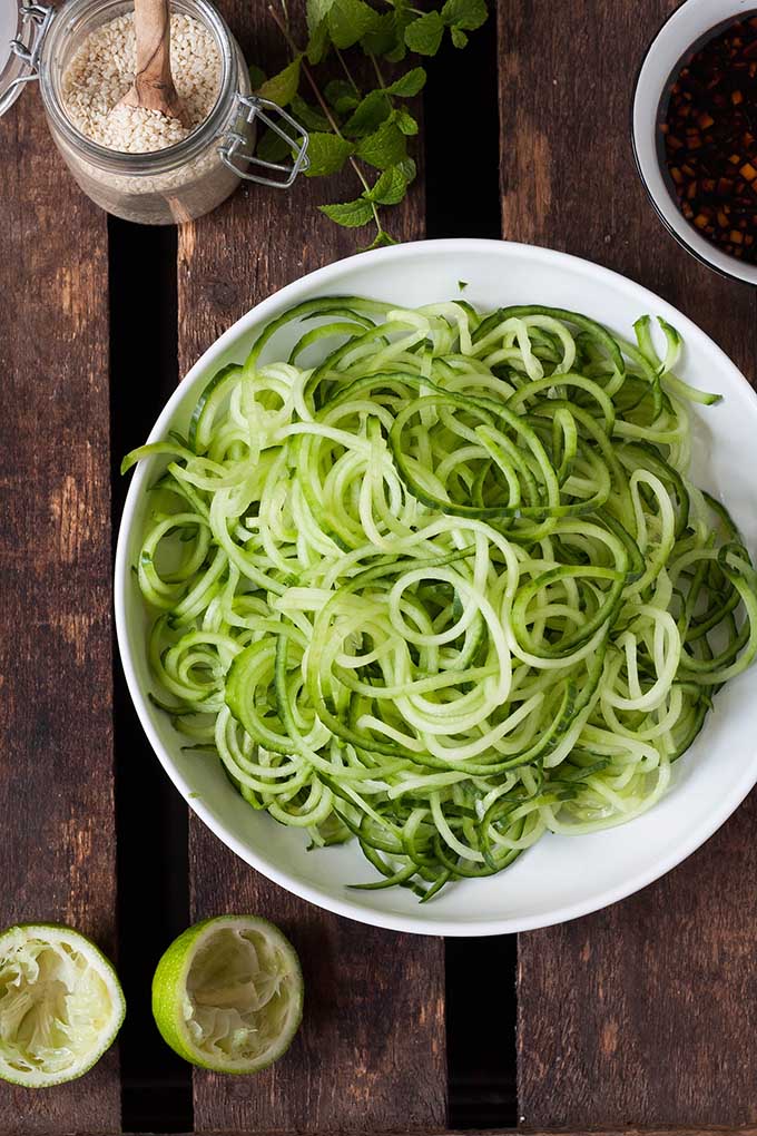 Erstens ist er herrlich erfrischend. Limetten-Sojasauce mit Ingwer, knackige Gurken-Spaghetti und Glasnudeln kühlen von Innen und sorgen für eine Erfrischung an heißen Sommertagen. Nummero dos: Für dieses Leckerchen steht ihr keine 15 Minuten in der Küche! Glasnudeln in heißem Wasser garen, Gurken-Spaghetti mit dem Spiralschneider*
