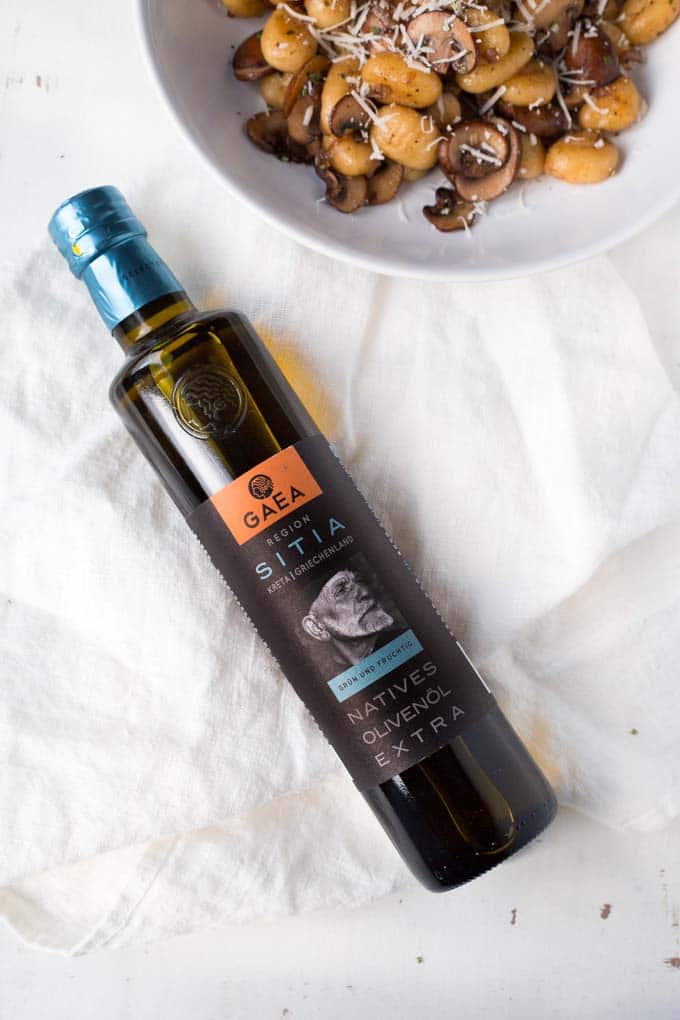 Ich habe für die Gnocchi mit Champignons und Parmesan das köstliche Olivenöl Sitia von Gaea verwendet. Dieses native Olivenöl Extra (wir erinnern uns: Erhitzen bis 180 Grad) wird aus handgepflückten, kaltgepressten  griechischen Oliven gewonnen. Es ist fruchtig-aromatisch mit einer leichten Peffernote und vor allem: LECKER! ?