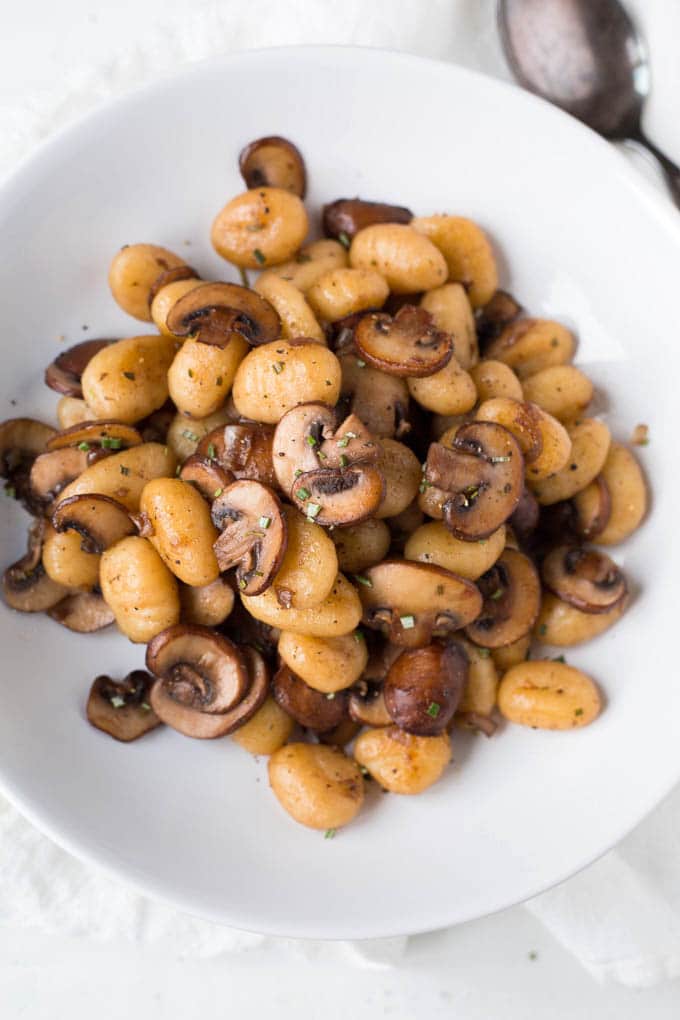 Ok Freunde. Wir sprechen hier von knusprigen, goldbraunen Gnocchi. Dazu gibt es in Olivenöl geschmorte Zwiebelwürfel und Champignons. Und das Beste: Die Gnocchi sind unglaublich schnell fertig!