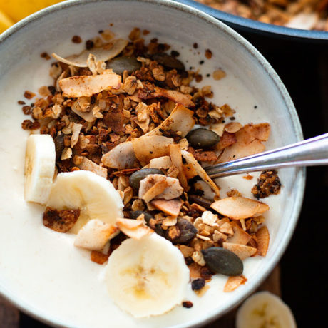 Hand auf's Herz: Wenn ich morgens merke, dass wir kein Müsli mehr haben, schmeiße ich nicht extra den Ofen für ne Ladung Peanut Butter Granola oder Knuspermüsli mit Kokos & Meersalz an. Aber nen paar Zutaten in die Pfanne werfen und ab und an umrühren? Kann ich - auch morgens um 6 Uhr! 😉
