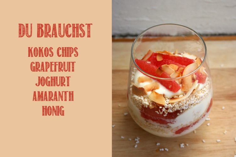 Grapefruit Joghurt Parfait mit Kokos und Amaranth – klingt das nicht nach einer köstlichen Kleinigkeit für zwischendurch? Genau das Richtige, um an einem langen Tag neue Power zu tanken. Die Kombination aus cremigem Joghurt, süßem Honig, gepopptem Amaranth und fruchtiger Grapefruit ist schön leicht aber trotzdem super sättigend. Übrigens macht sich das Grapefruit Joghurt Parfait auch super bei einem gemütlichen Brunch am Wochenende oder einem beeindruckenden Frühstück für die Liebsten.