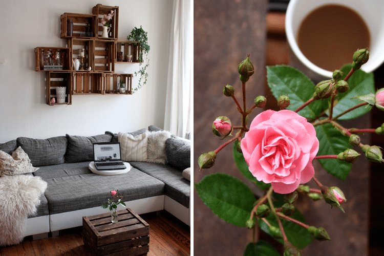 Zum krönenden Abschluss zeige ich noch meinen Arbeitsplatz 😉 Ich sitze nämlich beim Bloggen am liebsten auf unserem großen Sofa und gönne mir ein Käffchen. Das wundervolle Kisten-Regal über dem Sofa ist übrigens unser ganzer Stolz. Es war wirklich ein Kampf, die Kisten an unsere bröckelige Altbauwand zu bekommen, aber jetzt hängen sie alle. Abnehmen sollte man sie allerdings nicht mehr, die Wand dahinter sieht nämlich aus wie Schweizer Käse.