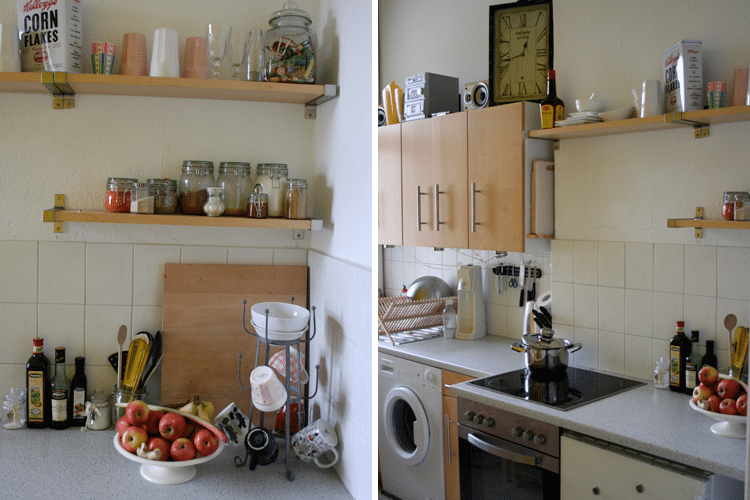 Obwohl sie für eine Studentenküche wirklich relativ groß ist, mit Ach und Krach passen auch 10 Mann um den verlängerten Esstisch, haben wir natürlich nicht genug Platz für alle Zutaten, Geschirr und Zubehör. Deswegen wird gestapelt, gestellt und getan, aber wir fühlen uns pudelwohl so 😉 Ich habe ein großes Faible für hübsche Vorratsgläser, deswegen haben sie einen Ehrenplatz auf dem Regal bekommen.