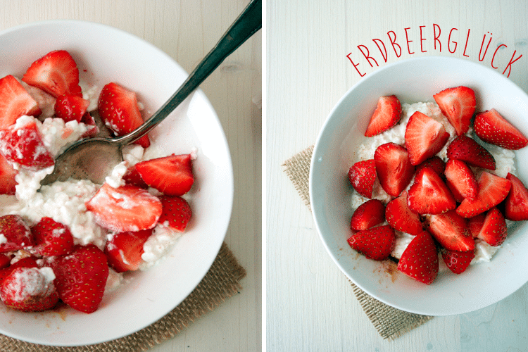 • Eine wahrlich fotogene Kombi, aber Erdbeeren sind ja eh sehr dankbare Fotoopfer 😉 Dann man ran an den Hüttenkäse!