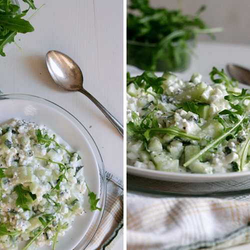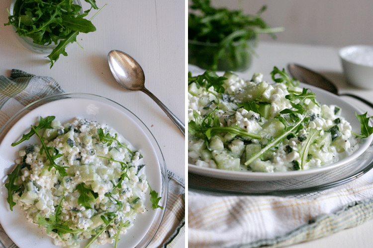 1. Der Salat ist grandios einfach. Im Grunde müsst ihr nur eine Gurke würfeln, eine Handvoll Rucola waschen und eine Limette auspressen. Dann vermischt ihr alles mit dem Hüttenkäse und gönnt dem grün-weißen Powersnack noch ein paar Umdrehungen Salz und Pfeffer. Geht’s noch einfacher? 2. ist der Hüttenkäse-Salat wirklich im Handumdrehen gemacht. Ich stecke ja momentan mitten in der Klausurenphase, da bin ich für jede gesparte Minute dankbar. 3. Hüttenkäse ist vollgepackt mit Proteinen, dazu fettarm und hält lange satt.