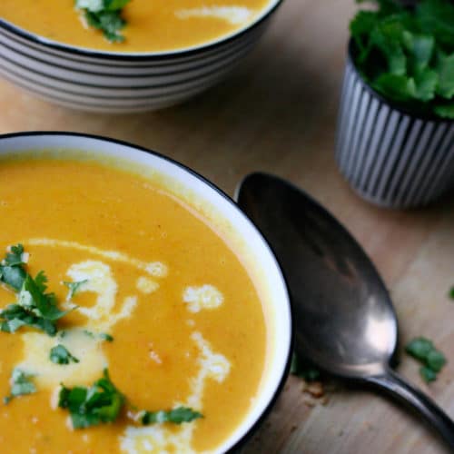 Diese Karotten-Erdnuss-Suppe mit Kokosmilch lässt sich auch super vorbereiten. Sodass du ganz easy einen kleinen Vorrat anlegen kannst. Dafür einfach die einfache oder doppelte Menge kochen, einen Teil einfrieren oder direkt in den Kühlschrank für die Woche. Genial!