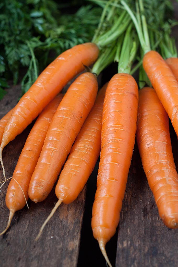 Karotten mit Karottengrün auf Holz - Kochkarussell.com