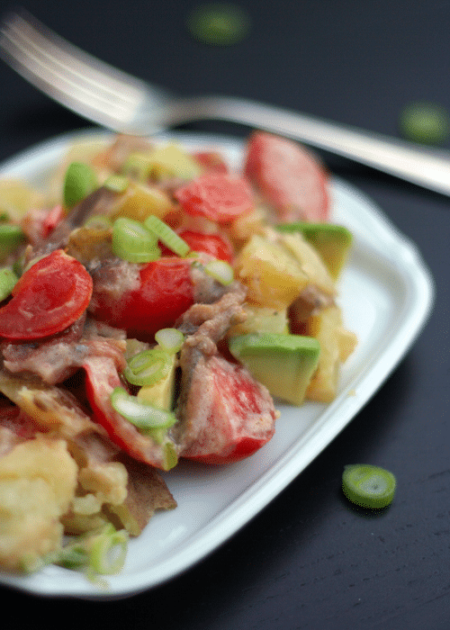 Was war das letzte richtig verrückte Gericht, das ihr gekocht habt? Vielleicht Pasta mit Schokosauce oder Kuchen mit Bacon? Bei mir war es definitiv der Kartoffelsalat mit Sardellen, Tomaten und Avocado. Einnert so überhaupt nicht an den typischen Kartoffelsalat, nicht wahr? Aber ich kann euch sagen meine Lieben, die Kombination aus würzigen Sardellen, geschmolzenen Tomaten und cremiger Avocado ist einfach himmlisch!