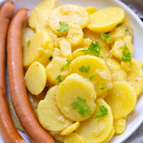 Ich liebe ja Rezepte, bei denen man noch ein bisschen Spielraum für Abwandlungen hat. Dafür ist dieser schwäbische Kartoffelsalat der ideale Kandidat: