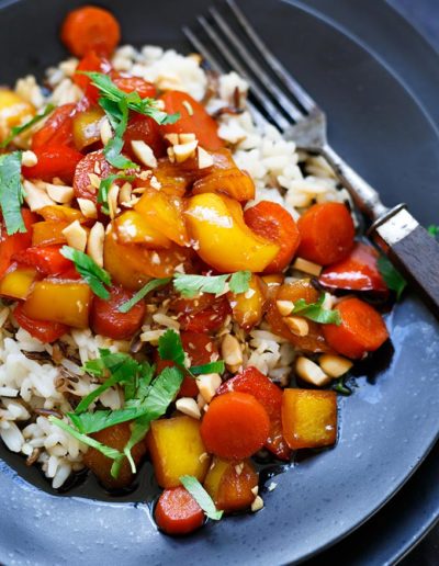 Teriyaki-Gemüse mit Reis und Erdnüssen