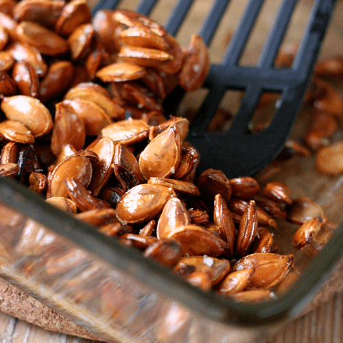 Da müssen die Kerne aus dem nächsten Kürbis kein trauriges Dasein als salzig geröstete trostlose Körchen führen, sondern werden richtig Deluxe weggeknabbert 😉