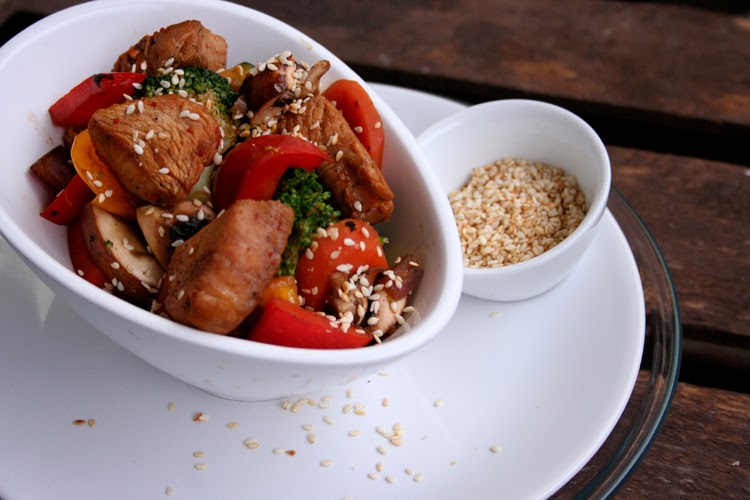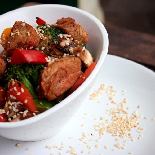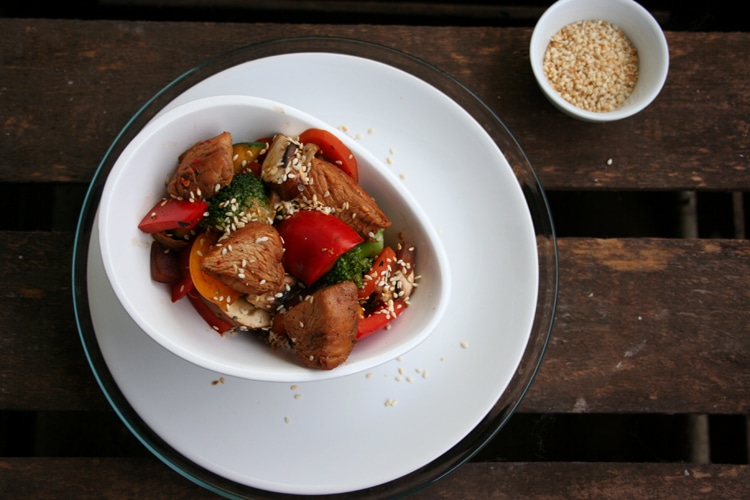 Sofort umsetzen könnt ihr die Tipps dann zum Beispiel bei einer großen Portion knackiges Wok-Gemüse mit Pute und Sesam. Das gab es bei uns nämlich in den letzten Tagen und der Liebste und ich waren schwer begeistert. Schon bei der ersten Gabel hat die Kombination aus würziger Sojasauce, scharfem Ingwer und den Röstaromen des Gemüses mir Herzchen in die Augen gezaubert. Nebenbei ist die Gemüsepfanne auch noch eine wunderbar vollwertige Mahlzeit, ganz ohne Kohlenhydrate.