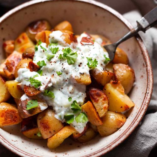 Aber ansonsten kann ich nur sagen: Probiert. Diese. Ofenkartoffeln! Von außen herrlich knusprig, von innen cremig-weich. Dazu gespickt mit in Olivenöl gebrutschelten Knoblauchscheibchen. Und als wäre das nicht genug, gibt’s auch noch herrlich cremiges, knoblauchiges, super einfaches Tzatziki dazu.
