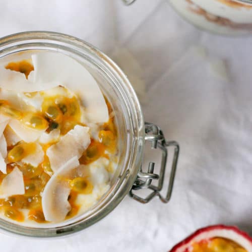 Hab ich schon erwähnt, dass diese gesunde Leckerei sich perfekt zum Mitnehmen eignet? Dafür schichtet ihr cremigen Kokos-Joghurt, spritzige Maracuja und Knuspercruch einfach in ein verschließbares Glas. Schon habt ihr einen gesunden Snack to go, mit dem ihr garantiert alle anderen Außerhalb-Esser neidisch macht.