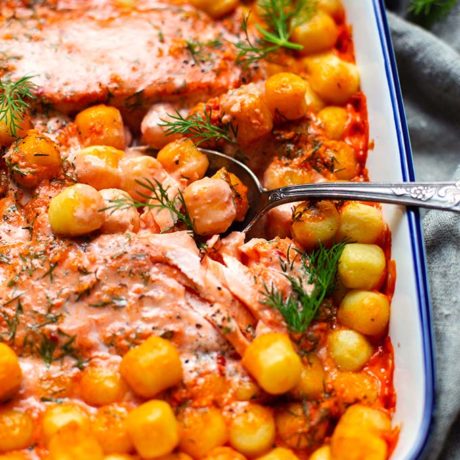 - Vollgepackt mit Lachs, Gnocchi und cremiger Tomaten-Sahne-Sauce.