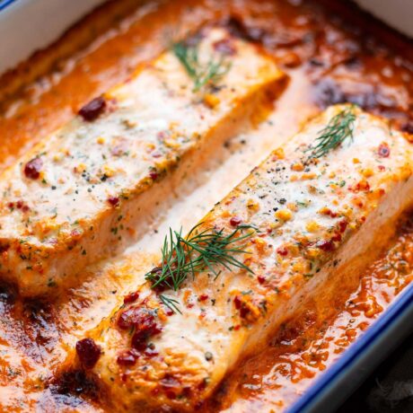 Ich liebe an diesem Rezept, dass ihr den Lachs direkt aus dem Tiefkühler in die Auflaufform schmeißt. So spart ihr Zeit und werdet am Ende trotzdem mit herrlich saftigem Lachs in Sahnesoße belohnt!