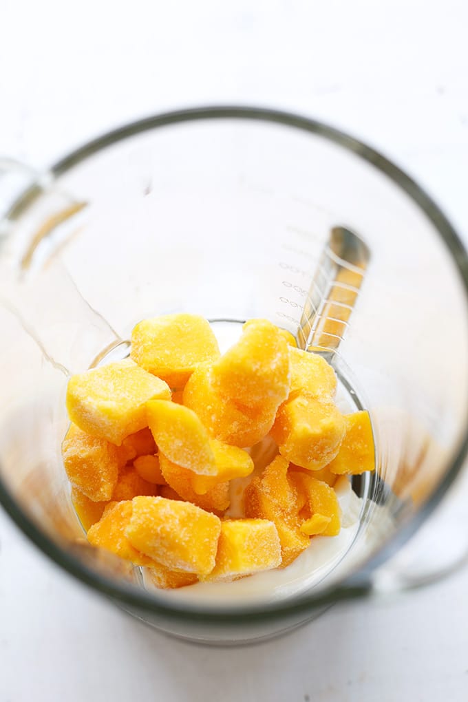 - Ein cremiger Mix aus gefrorener Mango, Banane und Naturjoghurt.