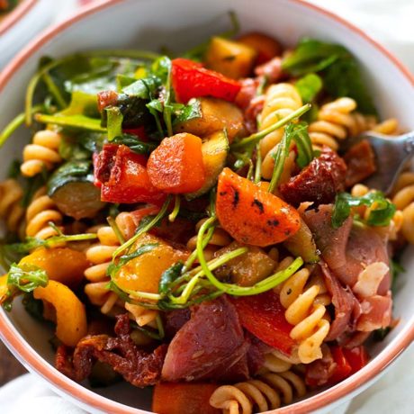 • Vollgepackt mit Nudeln, gebratenem Sommergemüse, Tomaten und Serrano Schinken.