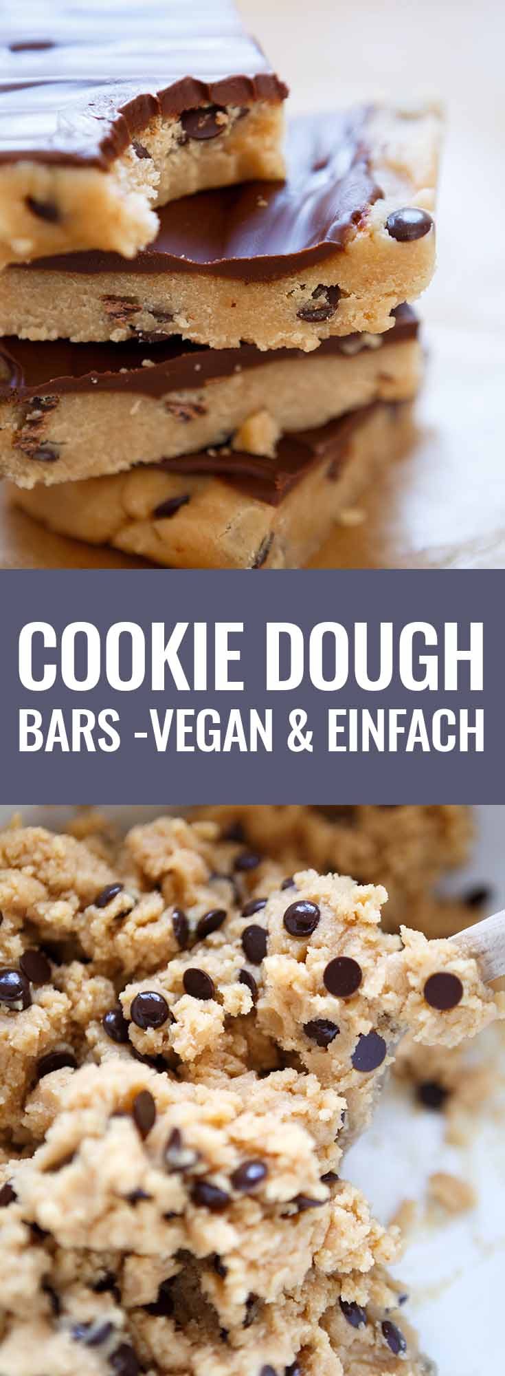 Werbung. No-Bake Chocolate Chip Cookie Dough Bars! Dieses 8-Zutaten Rezept ist dekadent reichhaltig, vegan und unfassbar lecker. Roher Keksteig überzogen mit geschmolzener Schokolade. Kommt garantiert gut an! - Kochkarussell.com #cookiedoughbars #cookiedough #vegan #dessert #vegandessert #chocolate