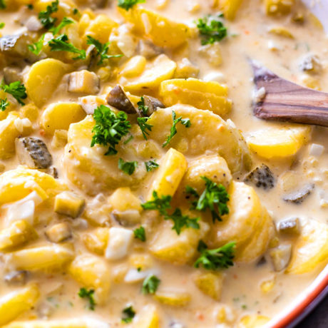 Vollgepackt mit deftigen Kartoffelscheiben, cremigster Mayo, wachsweichen Eier, knackigen Gewürzgurkenwürfelchen und Petersilie. Dieser Klassiker von Oma ist der Star bei jedem Familienfest und weg, bevor das erste Stück Fleisch auf dem Grill gelandet ist.