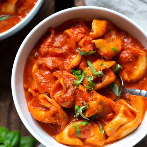 • Tortellini hinzufügen und 5-10 Minuten gar köcheln. Großzügig mit Salz und Pfeffer abschmecken und mit frischem Basilikum genießen.
