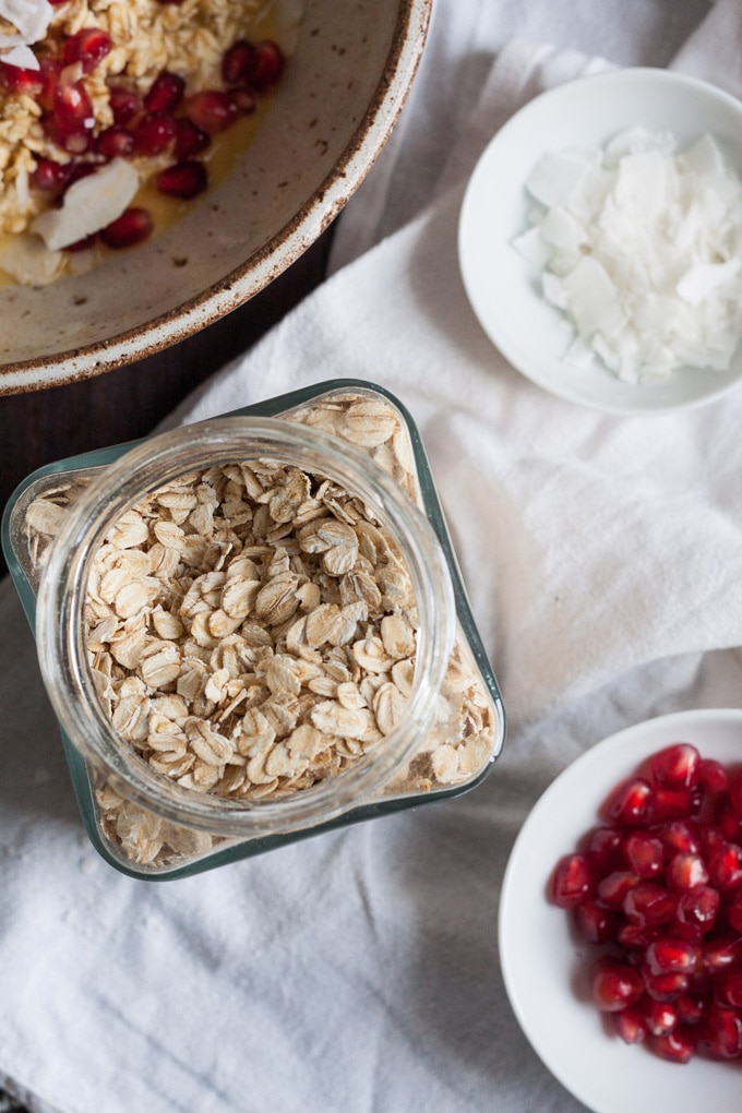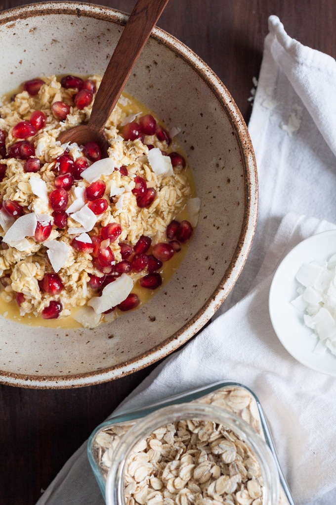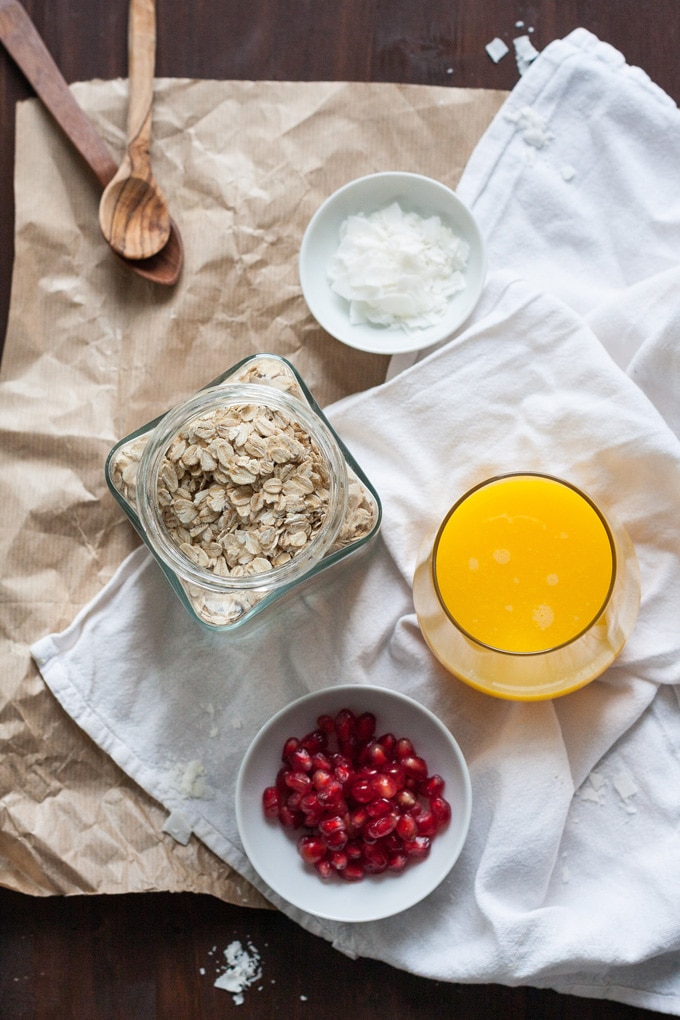 Für diese Overnight Oats braucht ihr gerade mal vier Zutaten. Das schnelle Frühstücksglück besteht aus Haferflocken, Orangensaft, Granatapfelkernen und Kokoschips. That’s it!